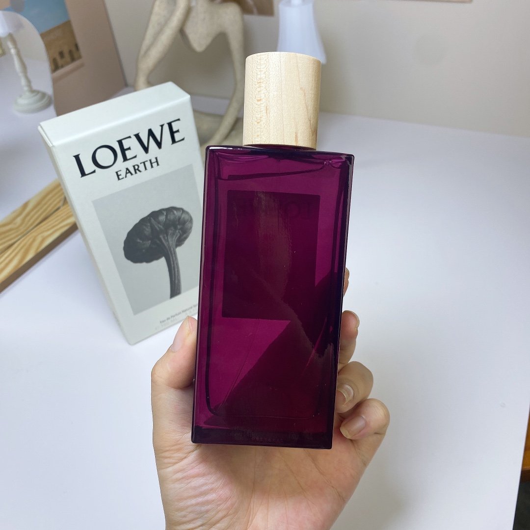 Loewe Earth Fragrance combines the aromas of violet, mimosa, and ash amber with musk, truffle, and pear. The perfume is stored in translucent glass bottles and is a bright purple color.